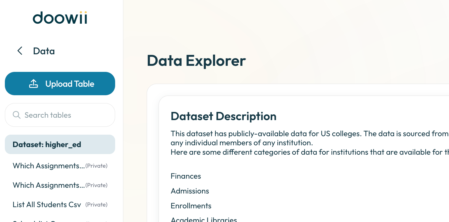 Upload your own data tables directly into Doowii to explore, visualize, and analyze them alongside your existing data. Doowii automatically detects column types, generates table and column descriptions then lets you know when the table finishes uploading, so you can start asking questions and generating insights.